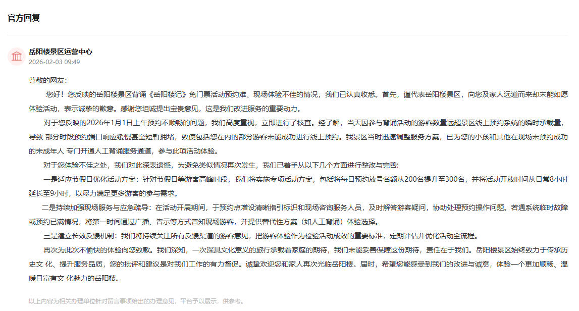 据回复称,经了解,当天因参与背诵活动的游客数量远超景区线上预约系统的瞬时承载量,导致部分时段预约端口响应缓慢甚至短暂拥堵,致使包括网友在内的部分游客未能成功进行线上预约。